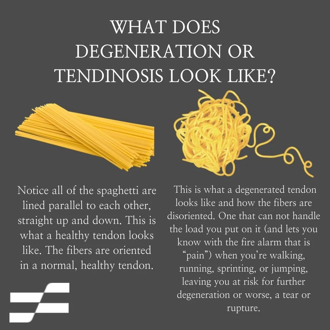 Check out the picture with the spaghetti above. This is a great example of what your tendon looks like when it degenerates into tendinosis. Instead of being straight, in line, and organized the tendon becomes weak, disorganized, and thicker.